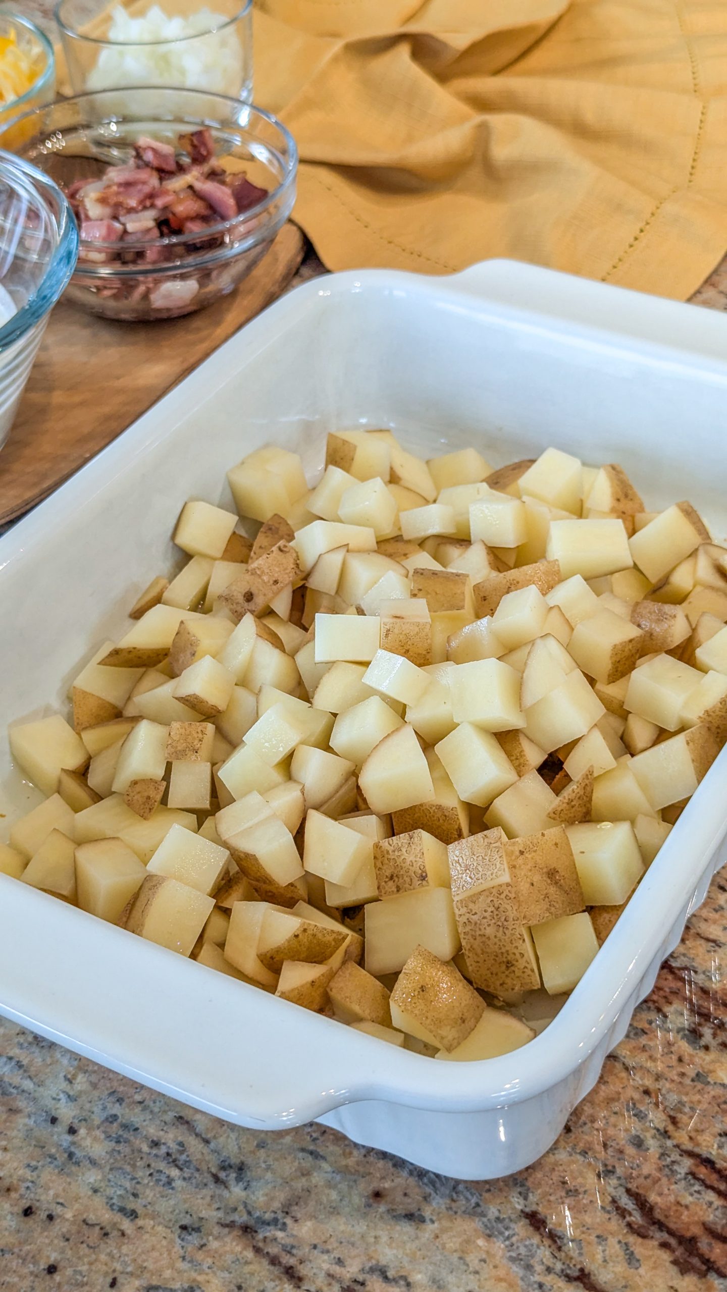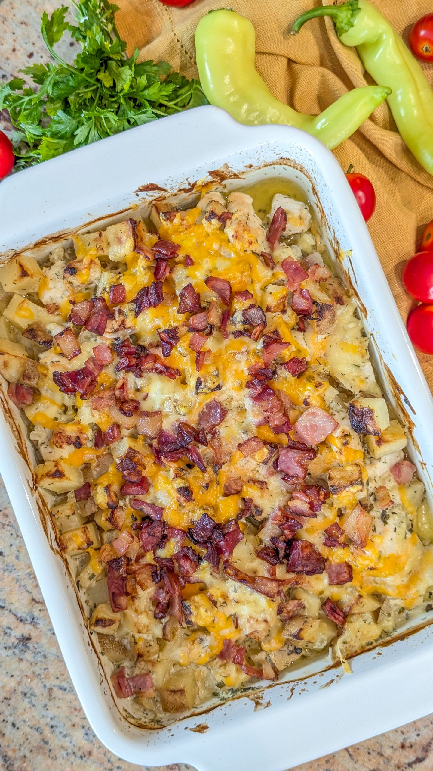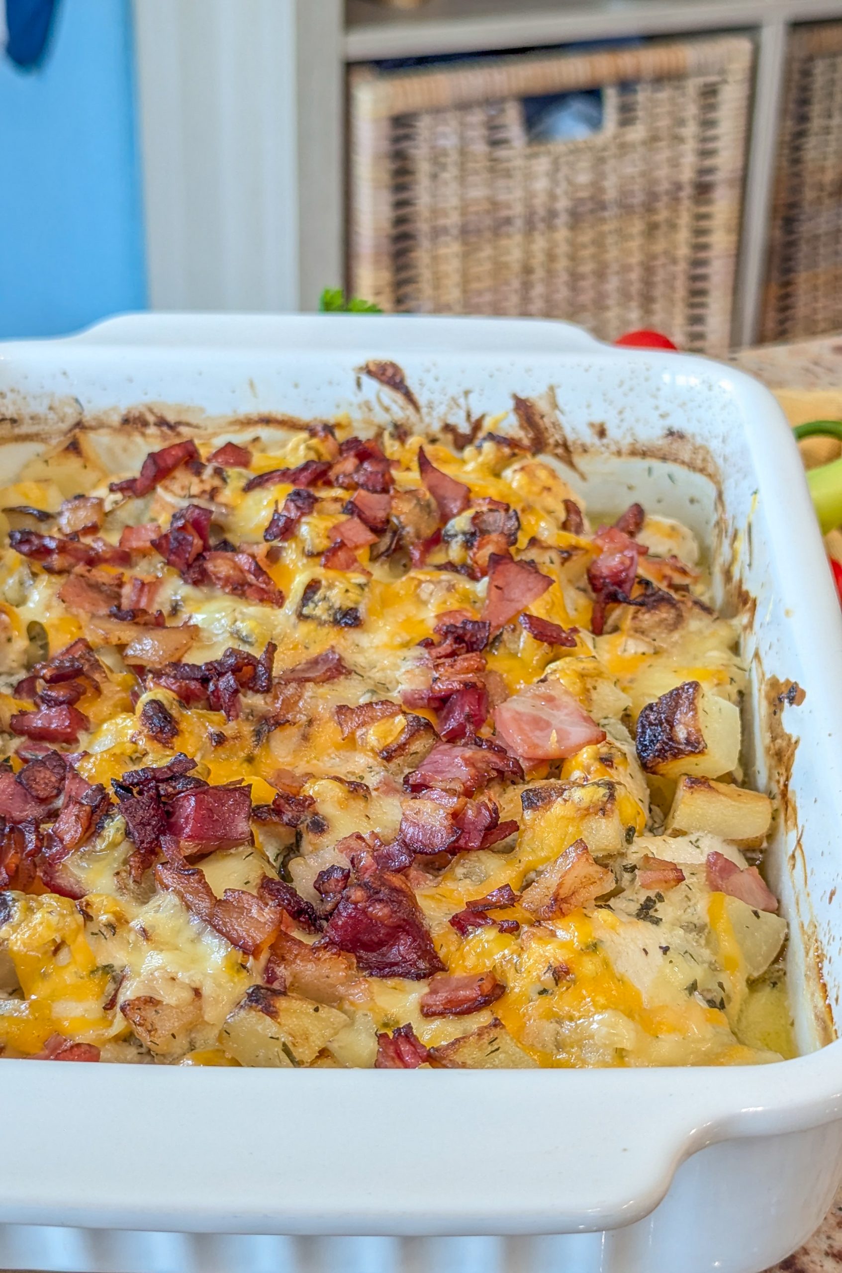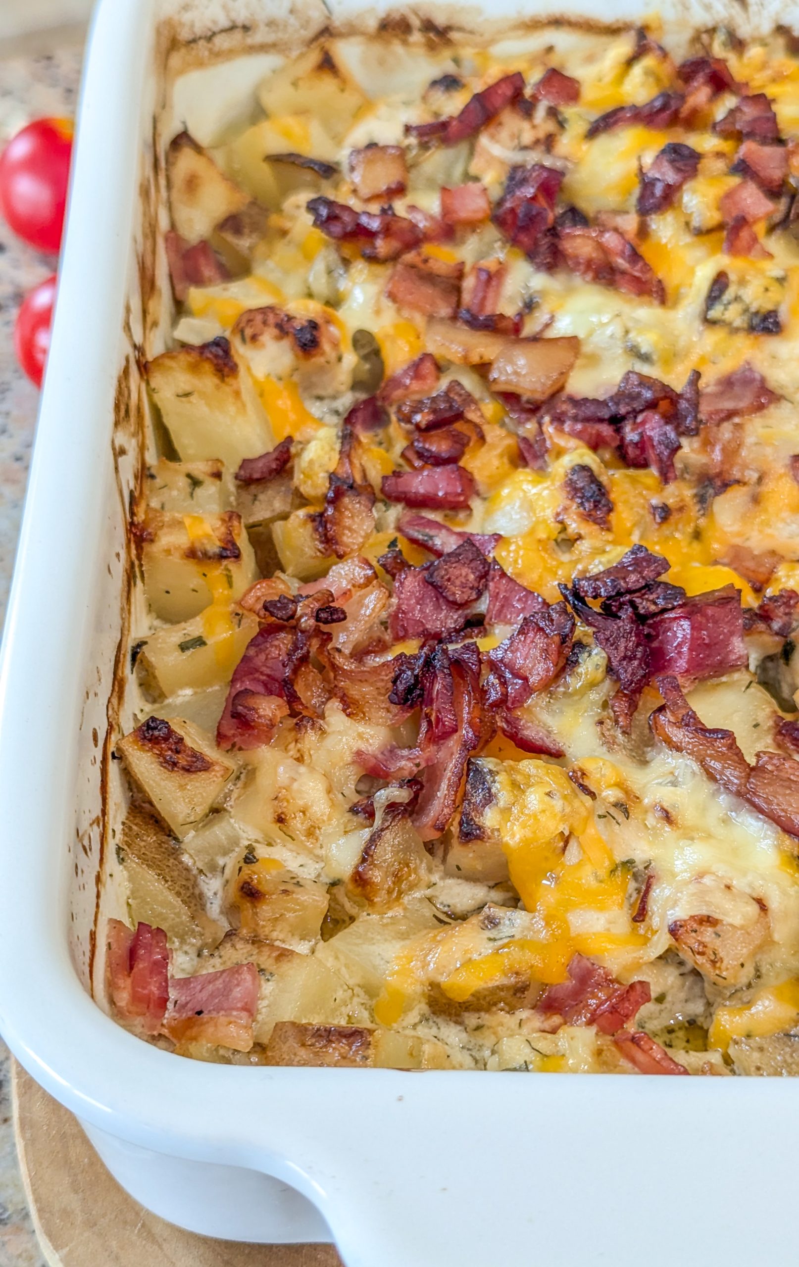 To enhance the flavor and texture, the casserole is topped with a generous layer of shredded cheese—cheddar, Monterey Jack, or a blend— which melts into a gooey, golden topping. Crispy bacon bits are often added to provide a delightful crunch and an extra savory flavor. Fresh chopped green onions or parsley can be sprinkled on top for a touch of color and freshness.